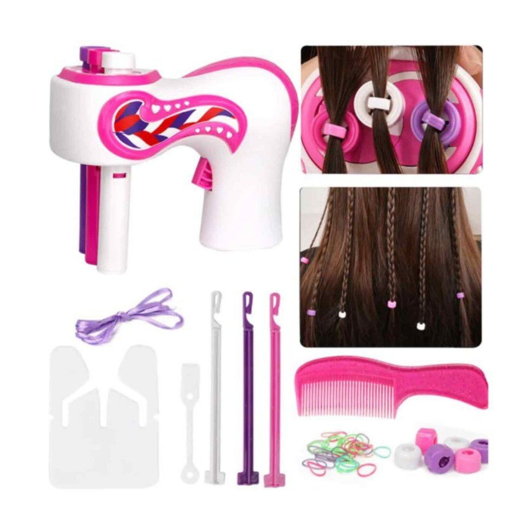 -Contenido del paquete: 1 máquina trenzadora, 9 pinzas decorativas, 3 tiradores de pelo, 3 piezas accesorias, 1 peine, 12 elásticos brillantes